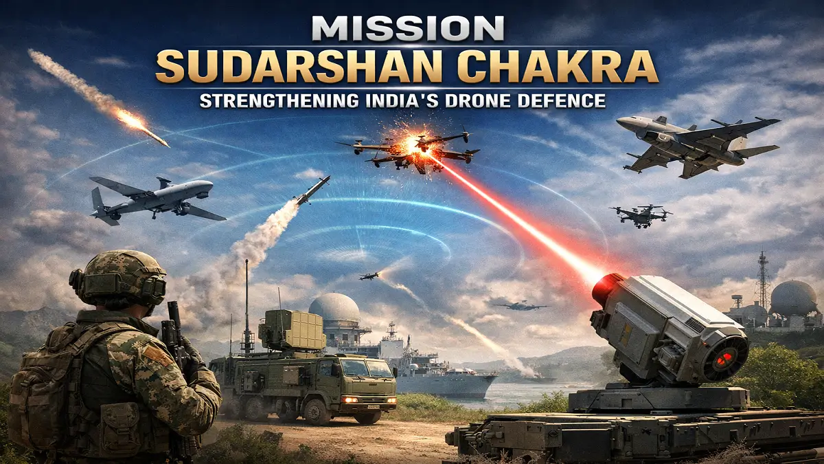 भारत ने उभरते हवाई खतरों, विशेषकर शत्रुतापूर्ण ड्रोन से निपटने के लिए मिशन सुदर्शन चक्र की शुरुआत की है। यह एक महत्वाकांक्षी राष्ट्रीय कार्यक्रम है, जिसका उद्देश्य देश के लिए समग्र, बहुस्तरीय वायु रक्षा कवच तैयार करना है। यह पहल आधुनिक युद्ध में मानवरहित हवाई प्रणालियों (UAVs) की बढ़ती भूमिका और पाकिस्तान से लगी संवेदनशील सीमाओं पर बढ़ते ड्रोन खतरों के मद्देनज़र भारत की रक्षा रणनीति में एक महत्वपूर्ण बदलाव को दर्शाती है।