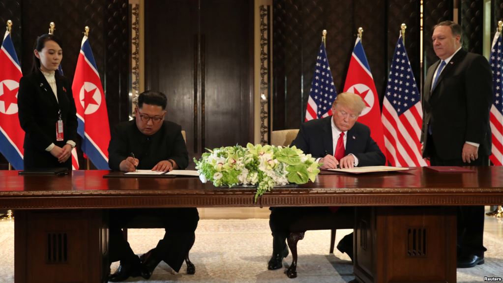 यह सिंगापुर के सेंटोसा द्वीप में अपनी ऐतिहासिक पहली वार्ता के बाद अमेरिकी राष्ट्रपति डोनाल्ड ट्रम्प और उत्तरी कोरियाई नेता किम जोंग यून द्वारा हस्ताक्षरित संयुक्त दस्तावेज के अनुसार है. दोनों देश शांति और समृद्धि के लिए दोनों देशों के लोगों की इच्छा के अनुसार नए संबंध स्थापित करने के लिए प्रतिबद्ध हैं.